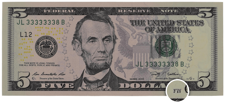 Some beginners, for example, attempt to complete a set of $1 Federal Reserve Notes (FRNs) from circulation by looking for one note of each combination of Federal Reserve District and Bureau of Engraving and Printing (BEP) facility. US notes are released to one of 12 Federal Reserve Districts, which are identified by a different letter in a seal on the front of the note. These notes are printed at facilities in either Washington, DC, or Fort Worth, Texas; the location can be determined by the presence, or absence, of a tiny “FW” for Fort Worth in the lower right corner of the front of the note.